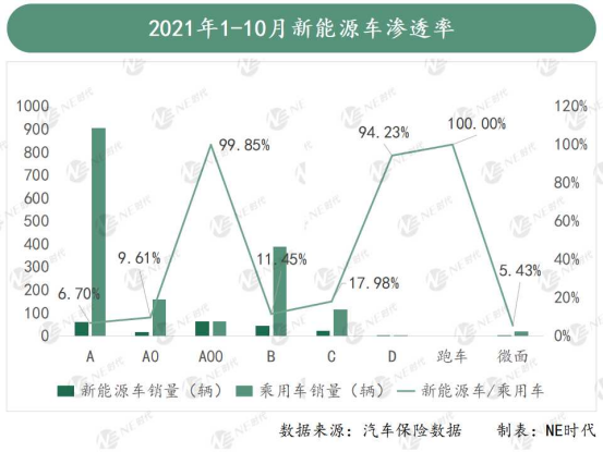 據(jù)汽車保險(xiǎn)數(shù)據(jù)顯示,目前整個(gè)乘用車市場(chǎng)以A、B、A0、C、A00級(jí)車為主。 以今年前十個(gè)月的銷量來(lái)看,這些主流級(jí)別車型中,新能源車滲透率最高的還是A00級(jí)車型,其他級(jí)別車型的電動(dòng)化替代空間基本都在90%以上。A級(jí)車作為乘用車市場(chǎng)體量最大的一部分,也是目前電動(dòng)化轉(zhuǎn)型壓力最大的一個(gè)市場(chǎng)。