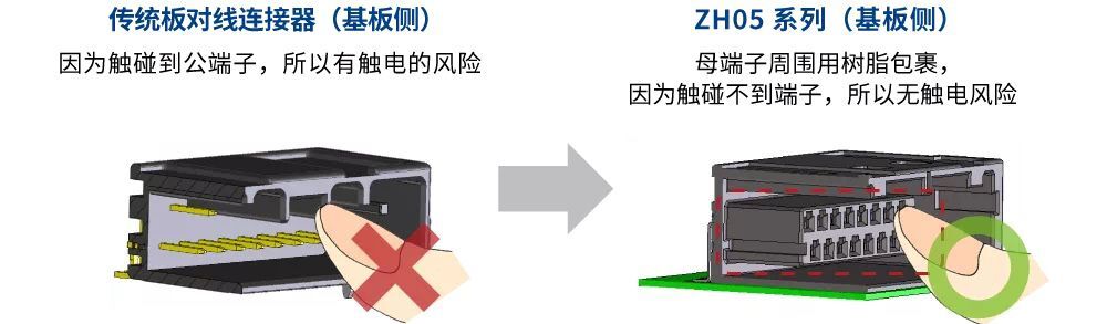 隨著電池生產(chǎn)數(shù)量的增加對安全性的要求 一般監(jiān)控車載電池電壓等連接到帶電部位時(shí),使用棒狀突出的公端子作為基板端的連接器。但是,現(xiàn)有的連接器端子形狀會產(chǎn)生異物附在相鄰端子之間,從而產(chǎn)生短路的風(fēng)險(xiǎn)。而且工作人員在進(jìn)行插拔作業(yè)時(shí)接觸到端子會有觸電的風(fēng)險(xiǎn)。在世界范圍內(nèi),隨著向混合動(dòng)力車和EV(電動(dòng)汽車)轉(zhuǎn)移的趨勢,電池的生產(chǎn)數(shù)量不斷增加,這也意味著風(fēng)險(xiǎn)的增加,那么安全對策就成為了當(dāng)務(wù)之急。 創(chuàng)造性的結(jié)構(gòu),確保高安全性 為了滿足這樣的需求,“ZH05”在追求車載品質(zhì)和防止觸電這兩點(diǎn)上進(jìn)行了開發(fā)。板對線連接器采用箱型的公端子,用樹脂將端子周圍物理性包圍使之絕緣,并實(shí)現(xiàn)了即便有異物進(jìn)入也不會造成短路,工作人員不會觸摸到端子的革新化的防觸電結(jié)構(gòu)。另外,采用了公端子獨(dú)有的雙彈簧結(jié)構(gòu),確保了適合車載內(nèi)部連接使用的耐熱性及耐振動(dòng)性,從而完成了高可靠性的連接器。并且,由于在電池方面,電池的容量很重要,所以也追求其小型化,這就是“ZH05”。 防觸電車載用板對線連接器“ZH05” (1) 基板端連接器的公端子周圍用樹脂包圍的防觸電構(gòu)造。