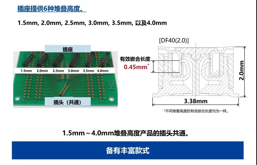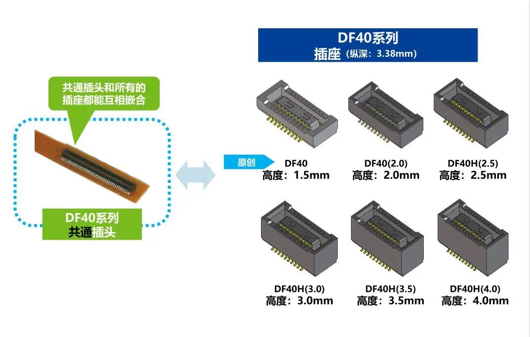 特點(diǎn) 1. 省空間:縱深3.38mm 2. 堆疊高度 1.5-4.0mm 3. 對(duì)應(yīng)USB4 Gen.2(10Gbps)信號(hào)傳輸 *1 4. 有效嵌合長度長:0.45mm 5. 卓越的端子構(gòu)造實(shí)現(xiàn)了明確的鎖扣手感以及大嵌合力 6. 防止端子變形構(gòu)造 7. 種類繁多(帶護(hù)罩:DF40G系列,帶完全鎖:DF40GL系列,ADAS:DF40T系列) 8.核心數(shù)量從10到120核心變化巨大 9.用導(dǎo)向肋確保自動(dòng)對(duì)準(zhǔn):0.33mm 10.防止鎳阻擋層焊接的結(jié)構(gòu) 11.還提供用于生產(chǎn)線檢查的高度耐用的連接器* 只有H=1.5 mm的產(chǎn)品支持Type-C DF40系列變體