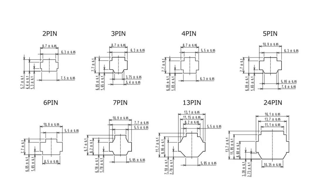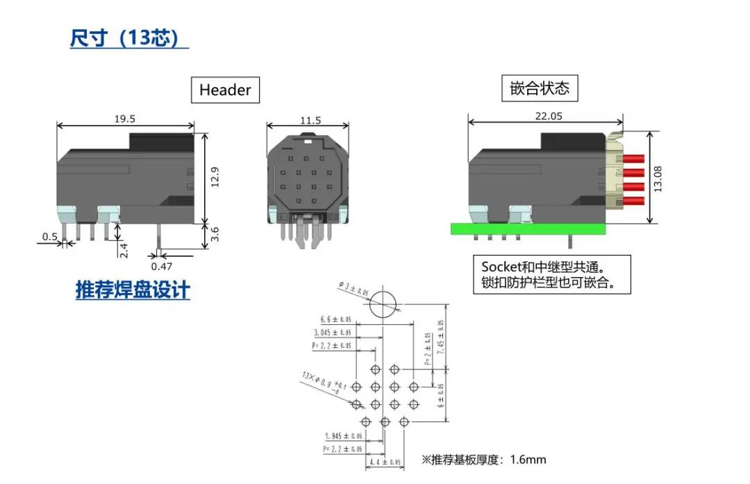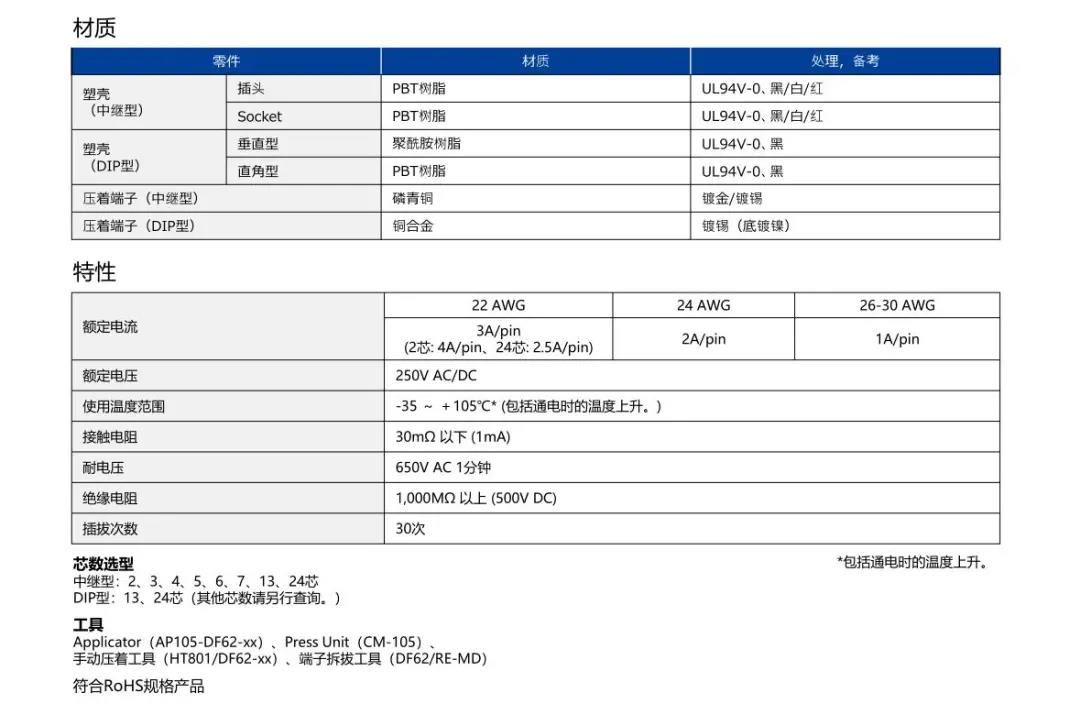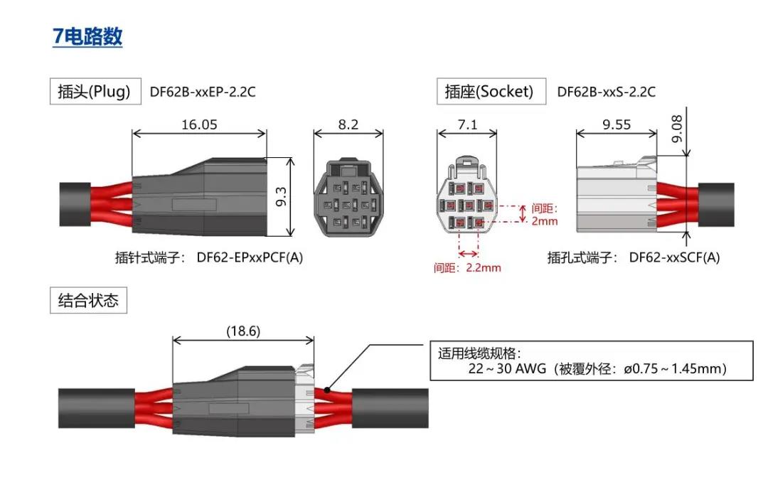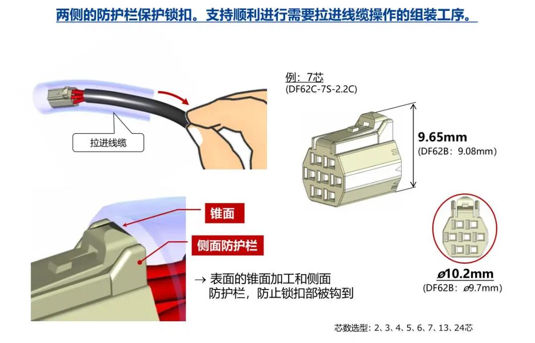 特點 [SignalBee?] 2 x 2.2 mm間距 用于狹小空間纖細型中繼連接器(UL C-UL認證產(chǎn)品) 1. 纖細光滑的外形適合狹窄空間的布線 2. 清晰的鎖扣感和目視可確認是否鎖定 3. 可靠的接觸結(jié)構 4. 堅固的端子結(jié)構 5. 芯數(shù)選型:2、3、4、5、6、7、13、24 DF62B:標準型 DF62C:鎖加部保護強化型 DF62P:面板安裝型 6. 可與DF11/DF59系列共用自動壓著設備 7. 防冷凝措施(防水型DF62W) 細小